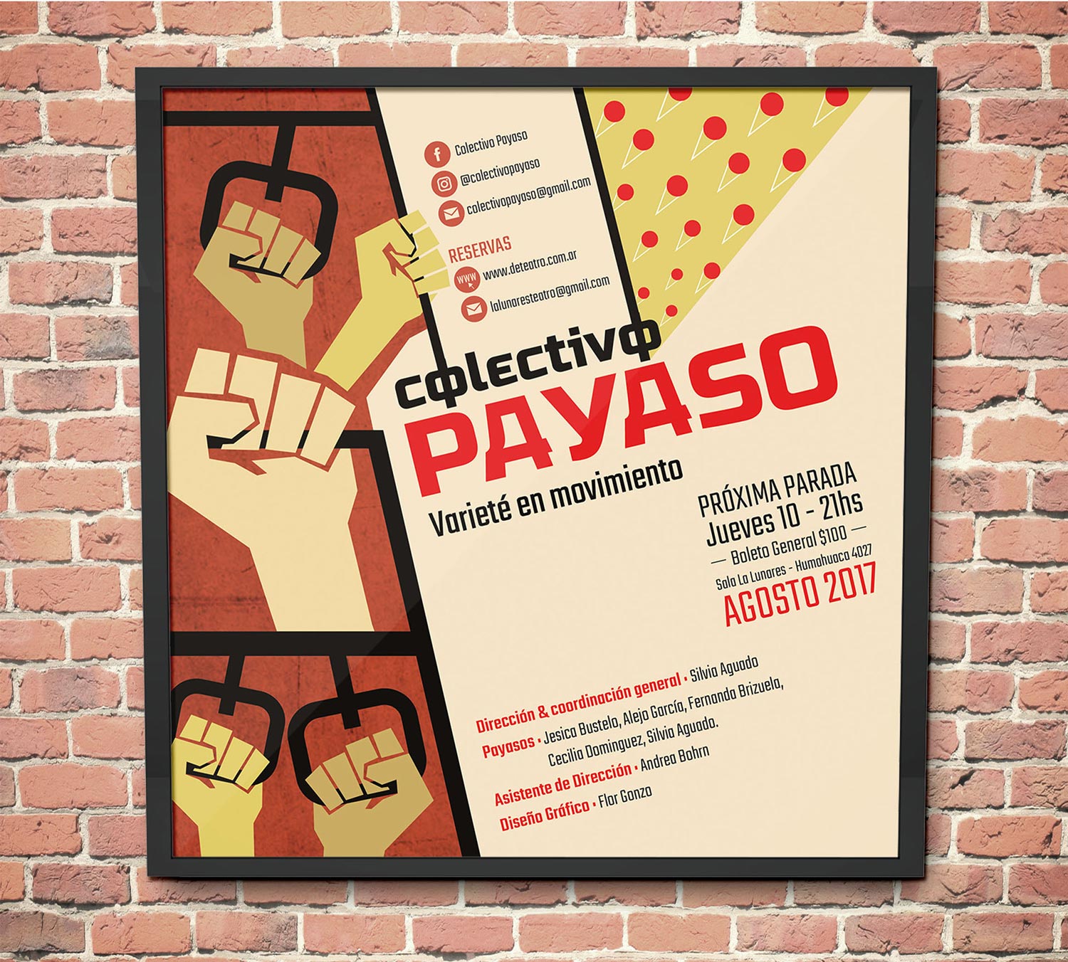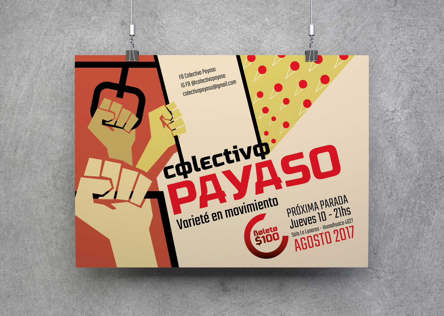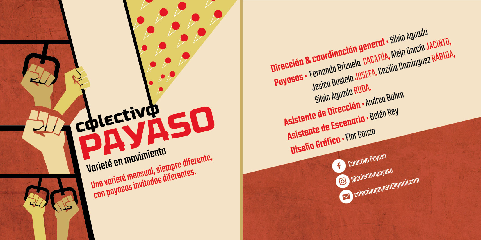Esta varieté de clown nace en 2017 como un espacio mensual de intercambio de voces y convoca a varias generaciones de payasos a explorar lo profundo y lo real, toca esas fibras sensibles y da un sacudón que estalla en risas. El Colectivo me convocó para que acompañe visualmente esta propuesta. La gráfica de la primera temporada surge teniendo como concepto guía “una revolución payasa colectiva”.