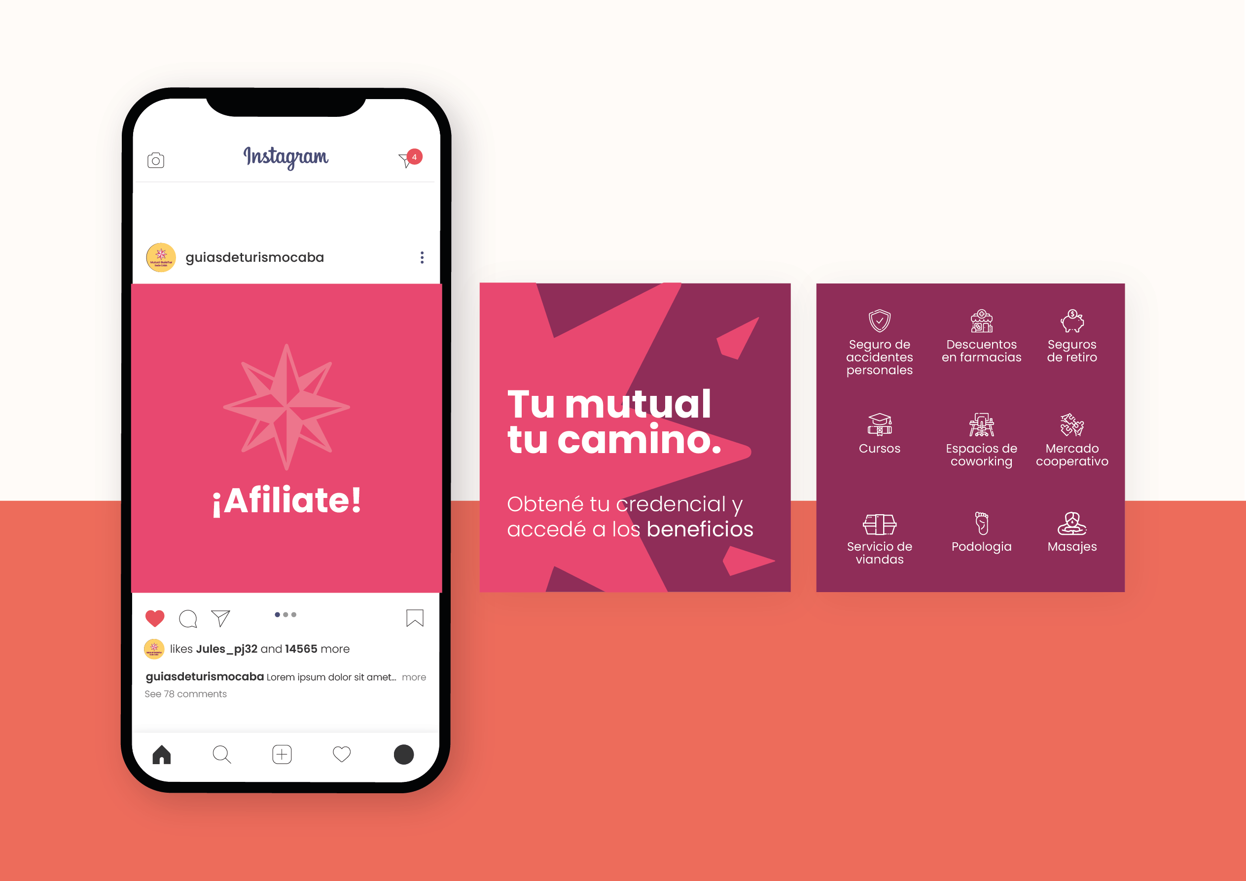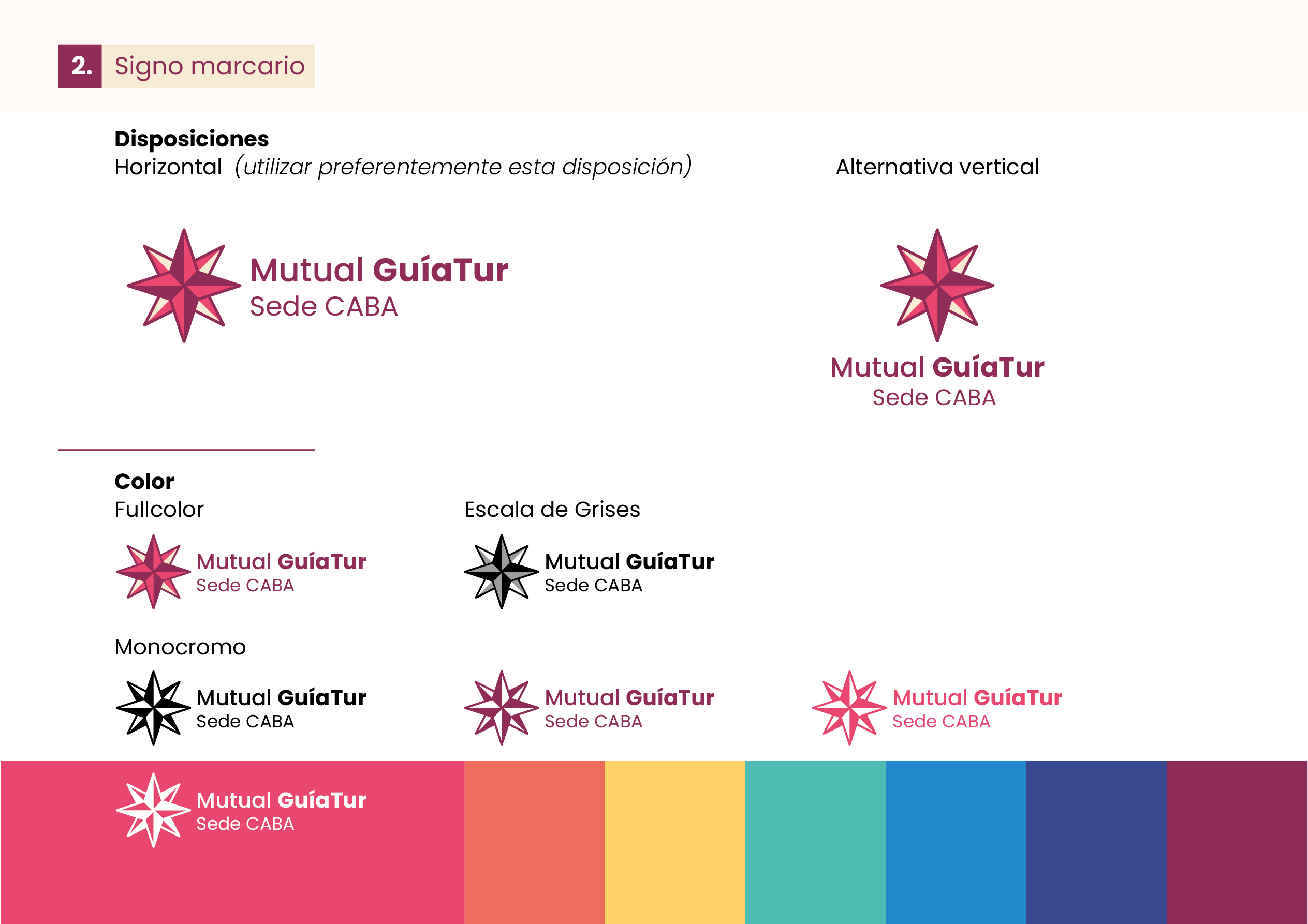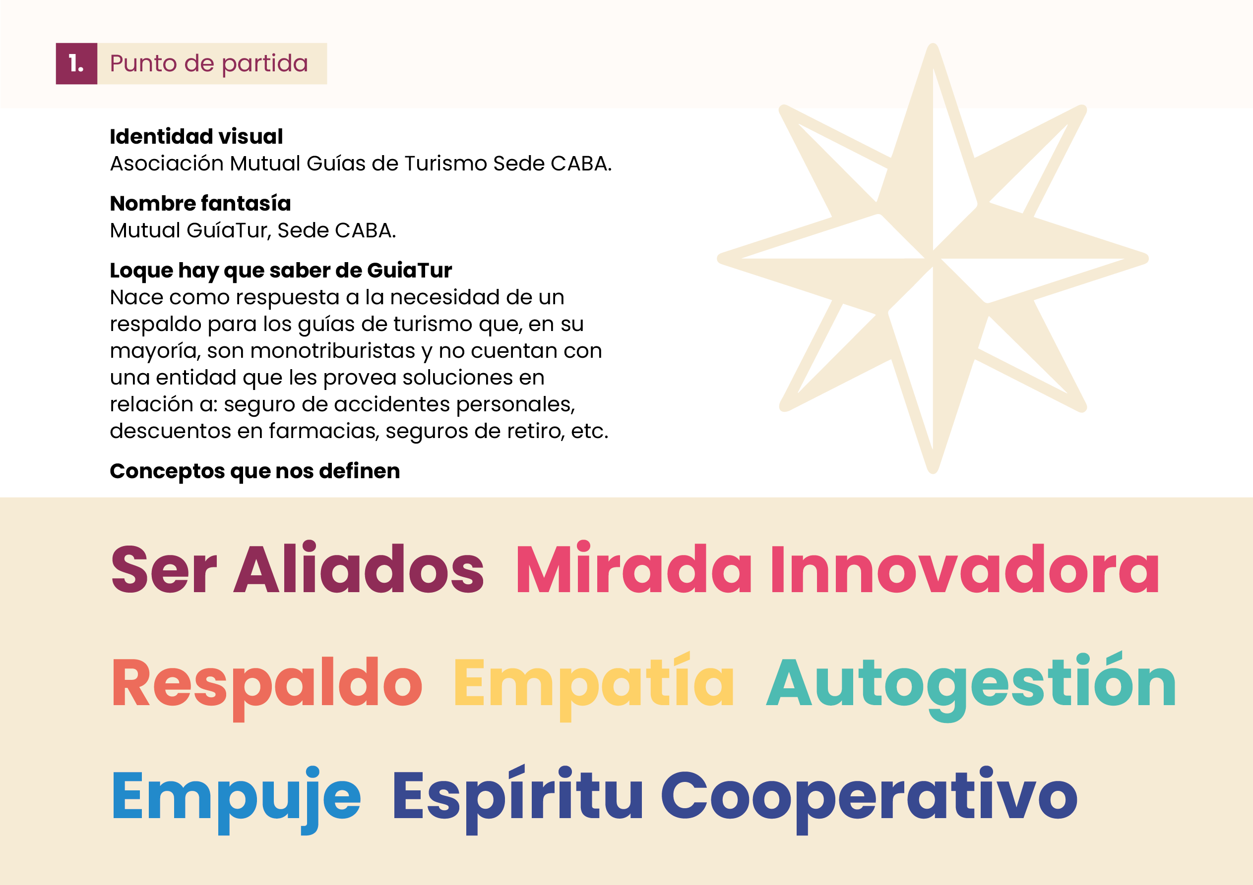 Se trata de un desarrollo de logo e identidad visual desde cero. La mutual fue creada para dar respuesta a la necesidad de tener una cobertura para los guías de turismo quienes suelen ser monotributistas. Tomé como punto de partida conceptos como: “ser aliados, mirada innovadora, respaldo, empatía, autogestión, empuje y espíritu cooperativo”. Así es como encontré en la brújula el elemento gráfico que me permitió plasmar estos conceptos y dar identidad a esta mutual que acompañará al guía turístico en su día a día.
