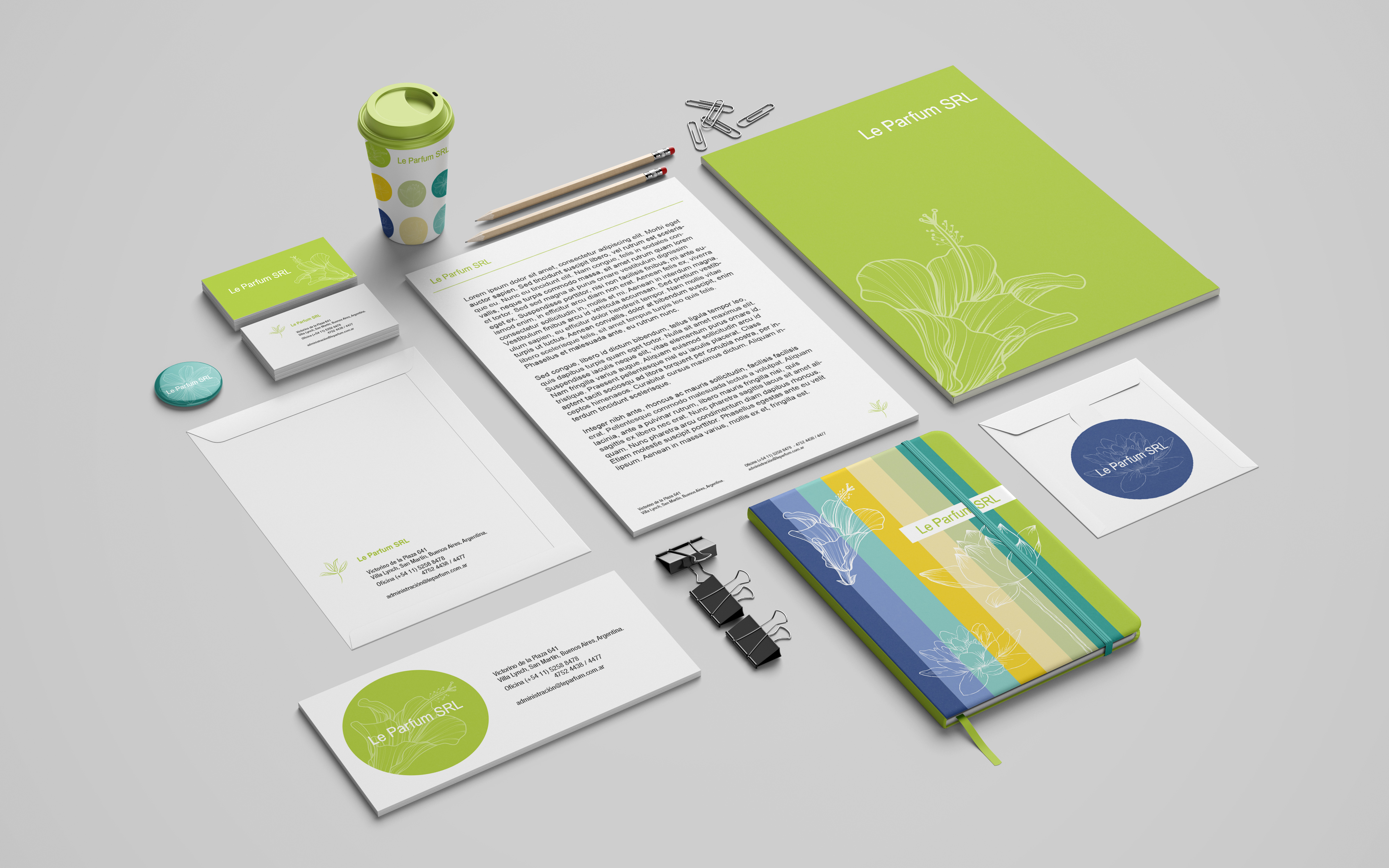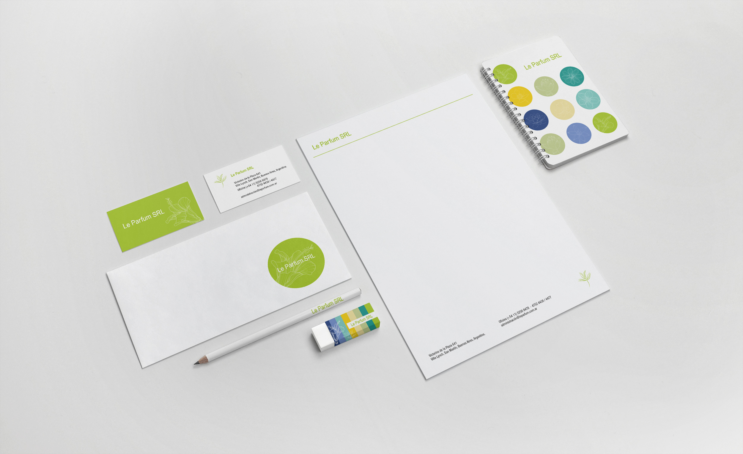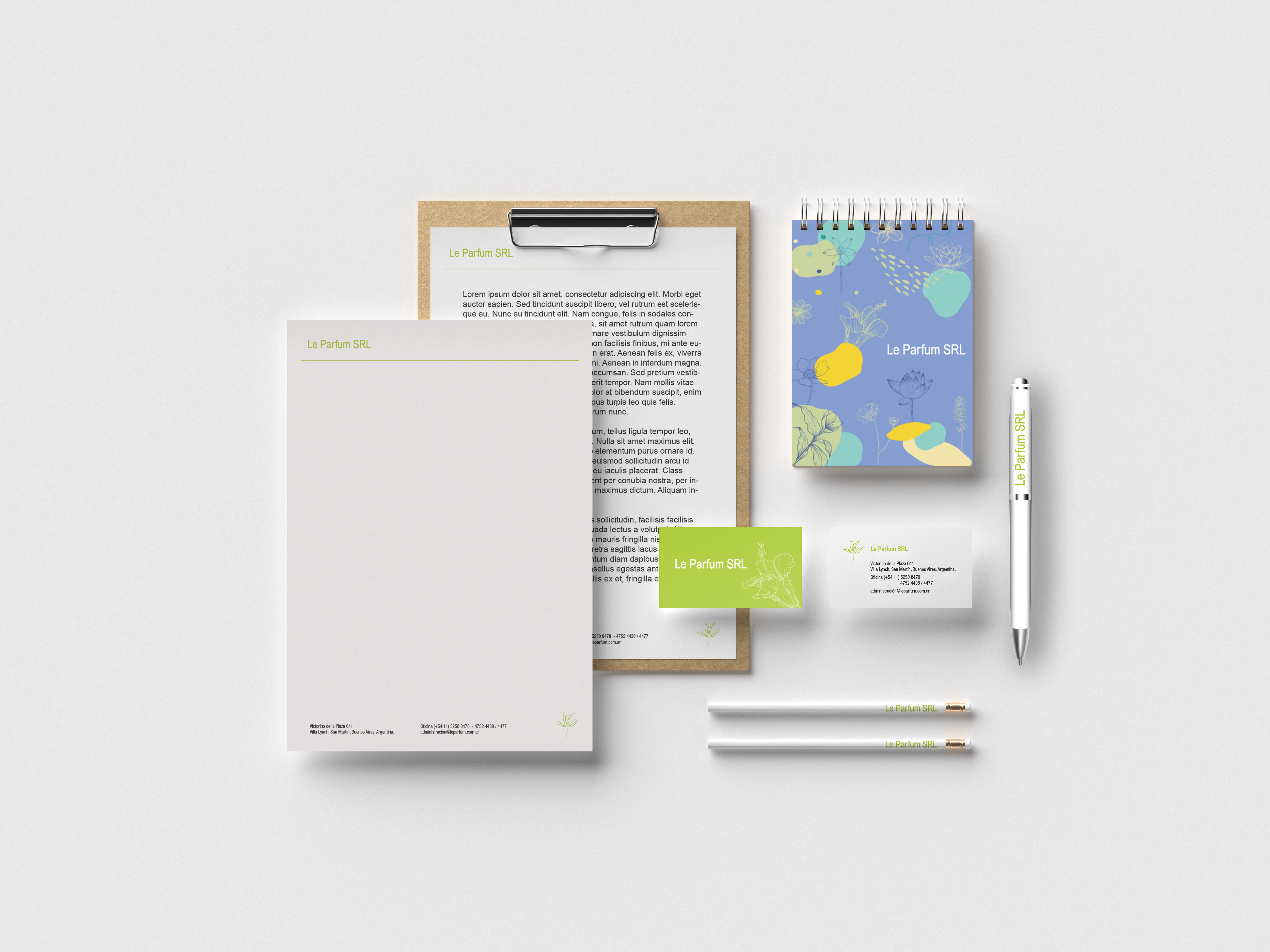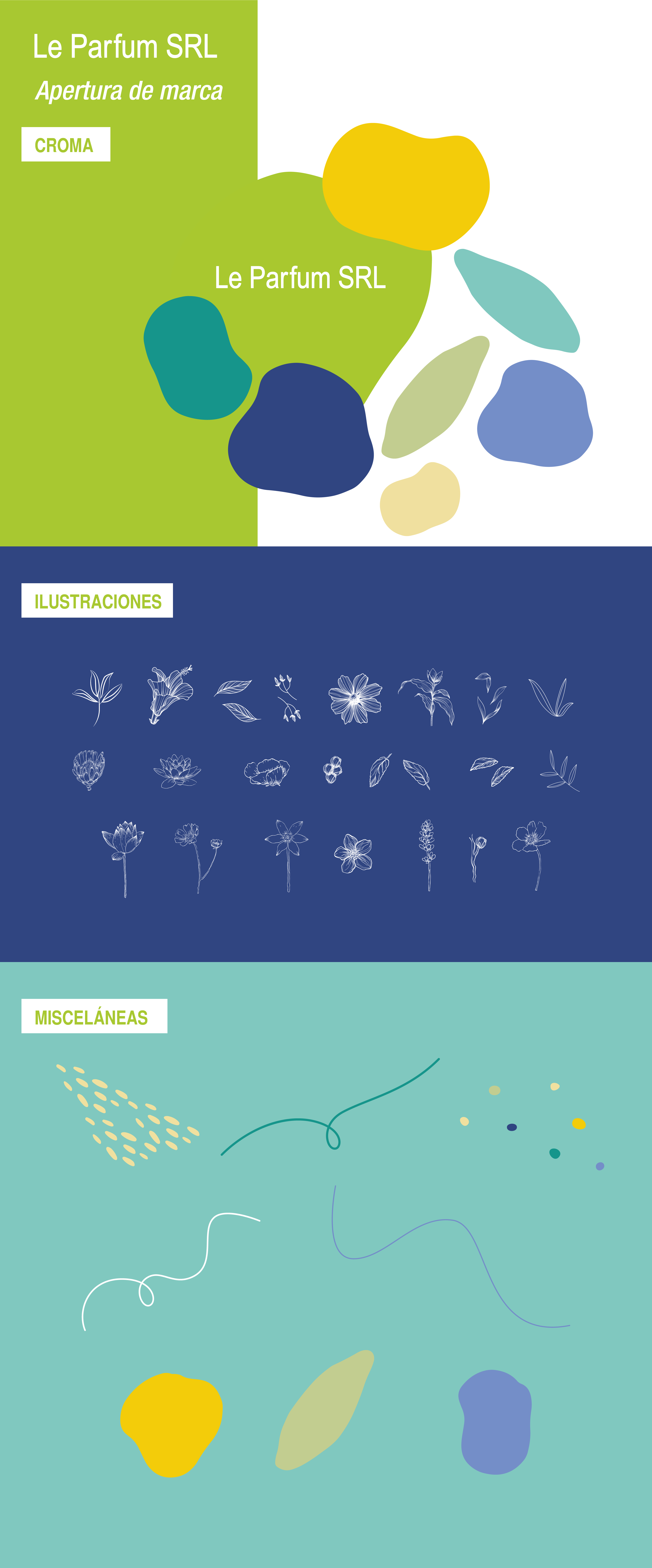 La clienta vino con un requerimiento específico: quería hacer merchandising para su empresa de desarrollo de fragancias pero SIN modificar su logo que históricamente venían utilizando. Es así como trabajé en la apertura de la marca para darle identidad a partir de la incorporación de elementos tales como una paleta cromática definida, ilustraciones, texturas e indicaciones de uso tipográfico. Tomando como concepto "La vista como complemento del olfato" y sin modificar su logo (solo haciendo algunos ajustes tipográficos ópticos y sutiles), logré desarrollar esta propuesta de branding con la cual se identificaron de inmediato.