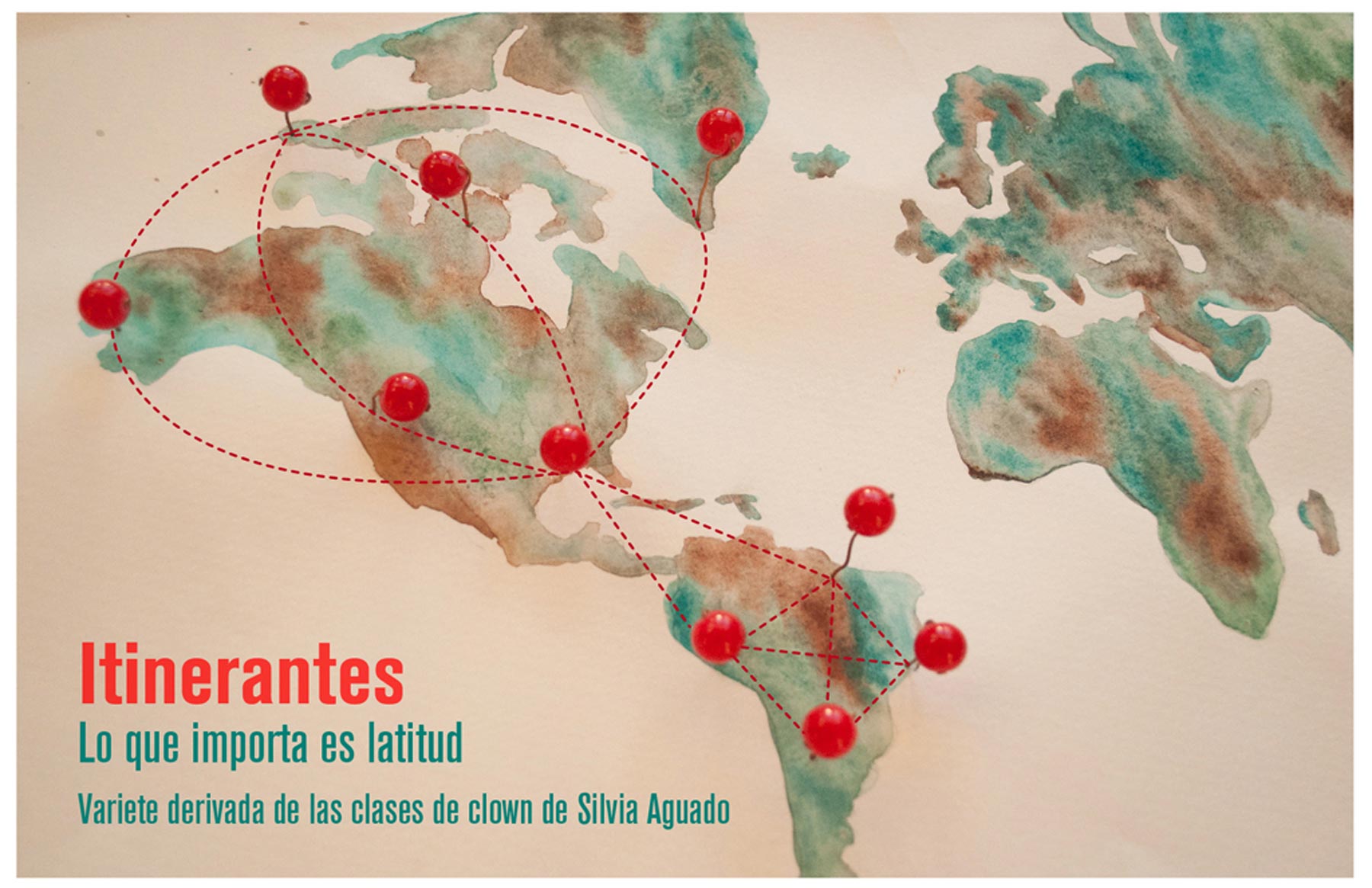 Itinerantes es una varieté de clown con números producidos a partir de un taller de entrenamiento para payasos. Este grupo de payasos viajeros te llevan a recorrer el mundo sin salir de la silla. Para ellos diseñé esta imagen de difusión combinando la ilustración con acuarelas, la fotografía y la ilustración vectorial.